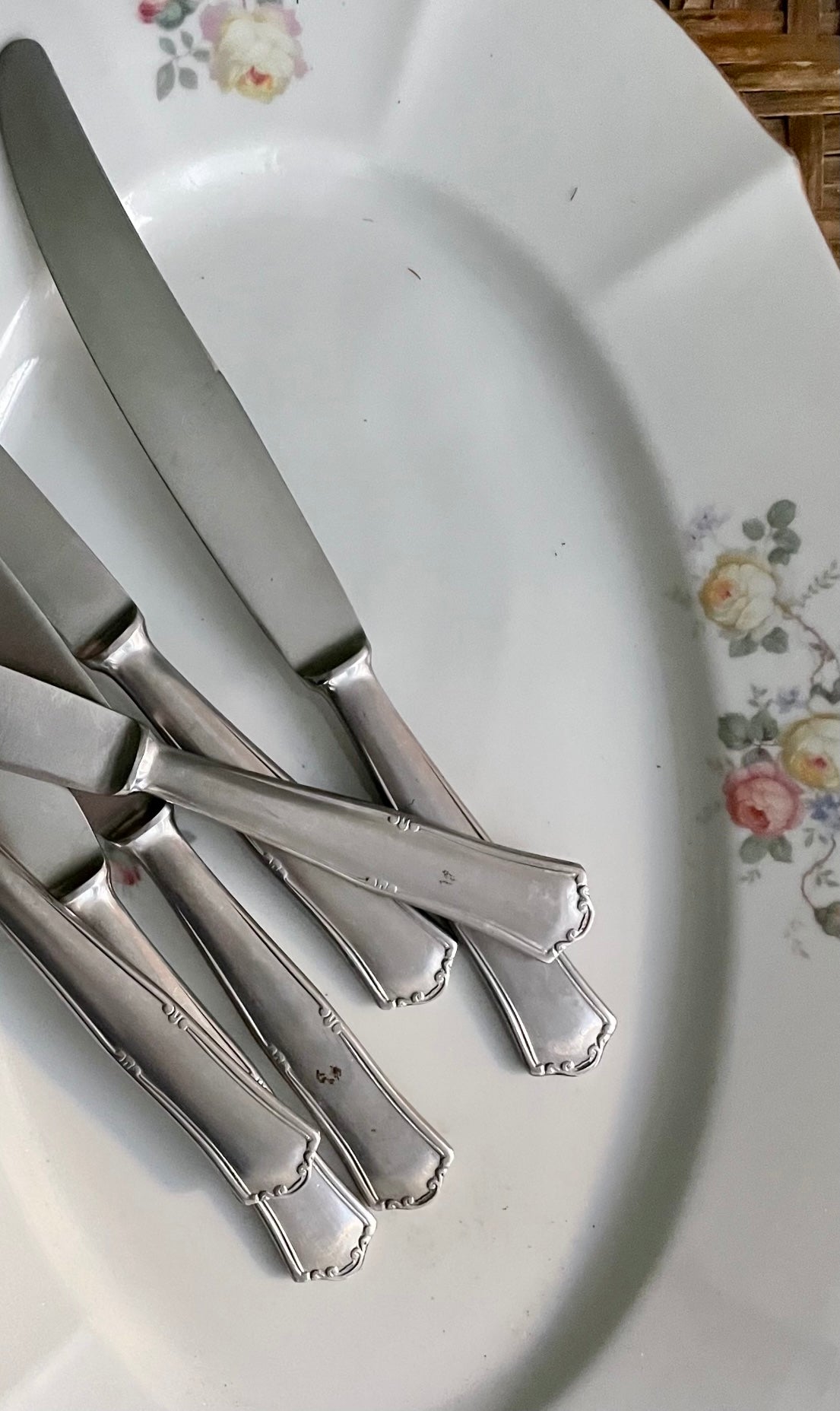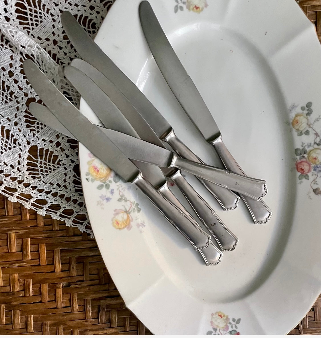 Sei coltelli con manici decorati. Lunghezza totale 24 cm.