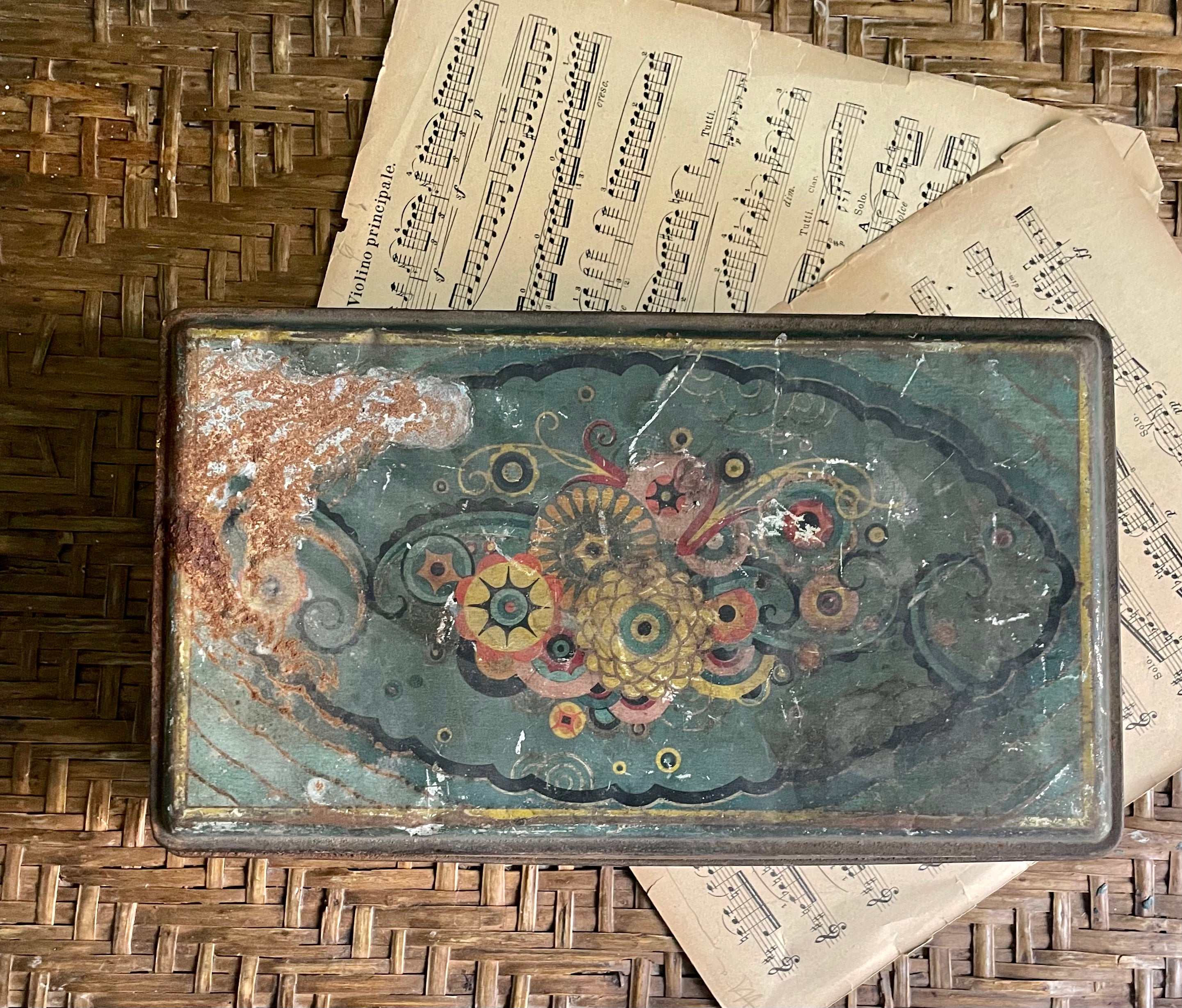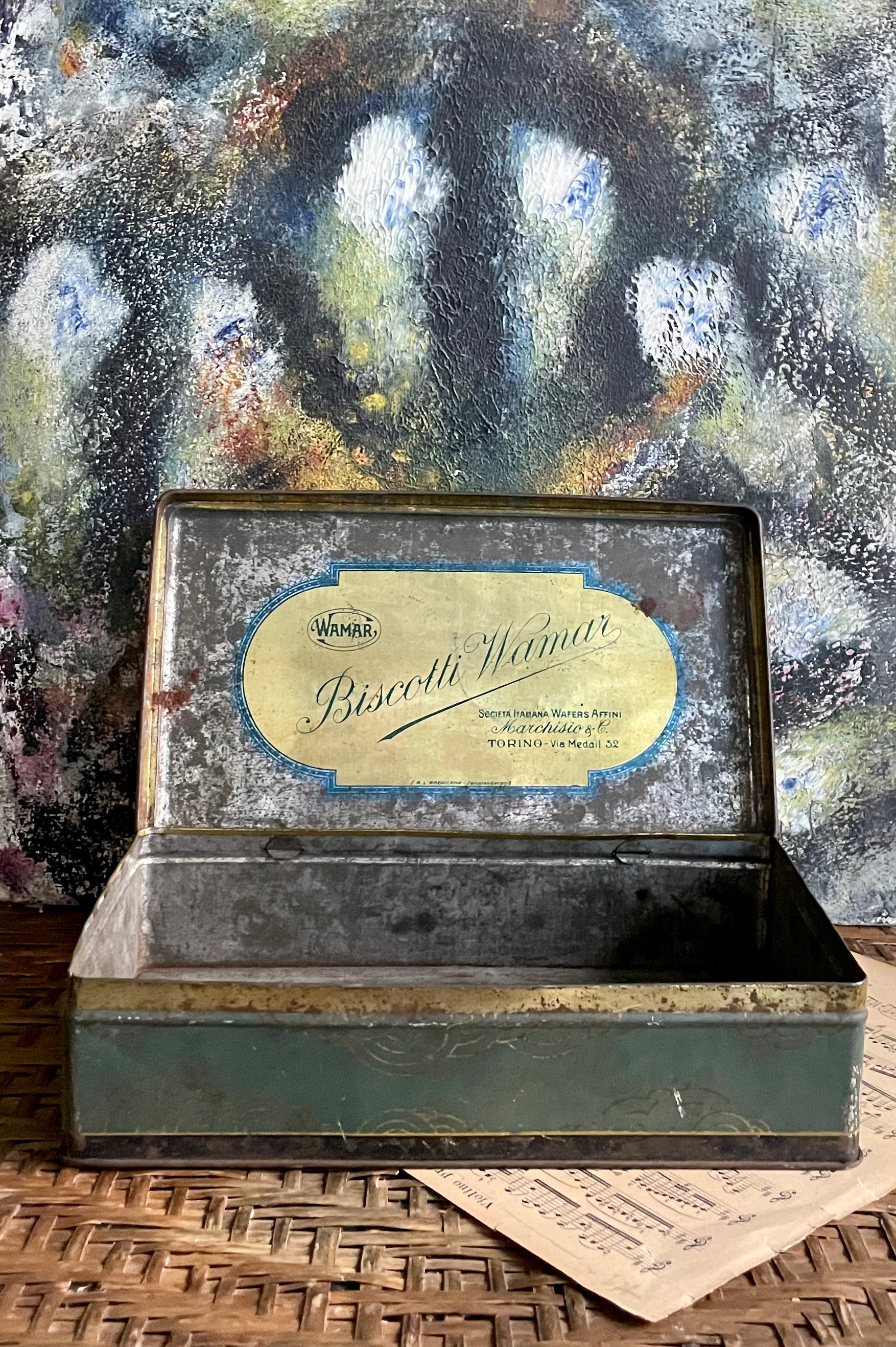 Scatola in latta rettangolare (31x18 cm) con disegno geometrico sul coperchio. In passato è stata confezione di biscotti Wamar. Come da fotografie ha macchie di ruggine.