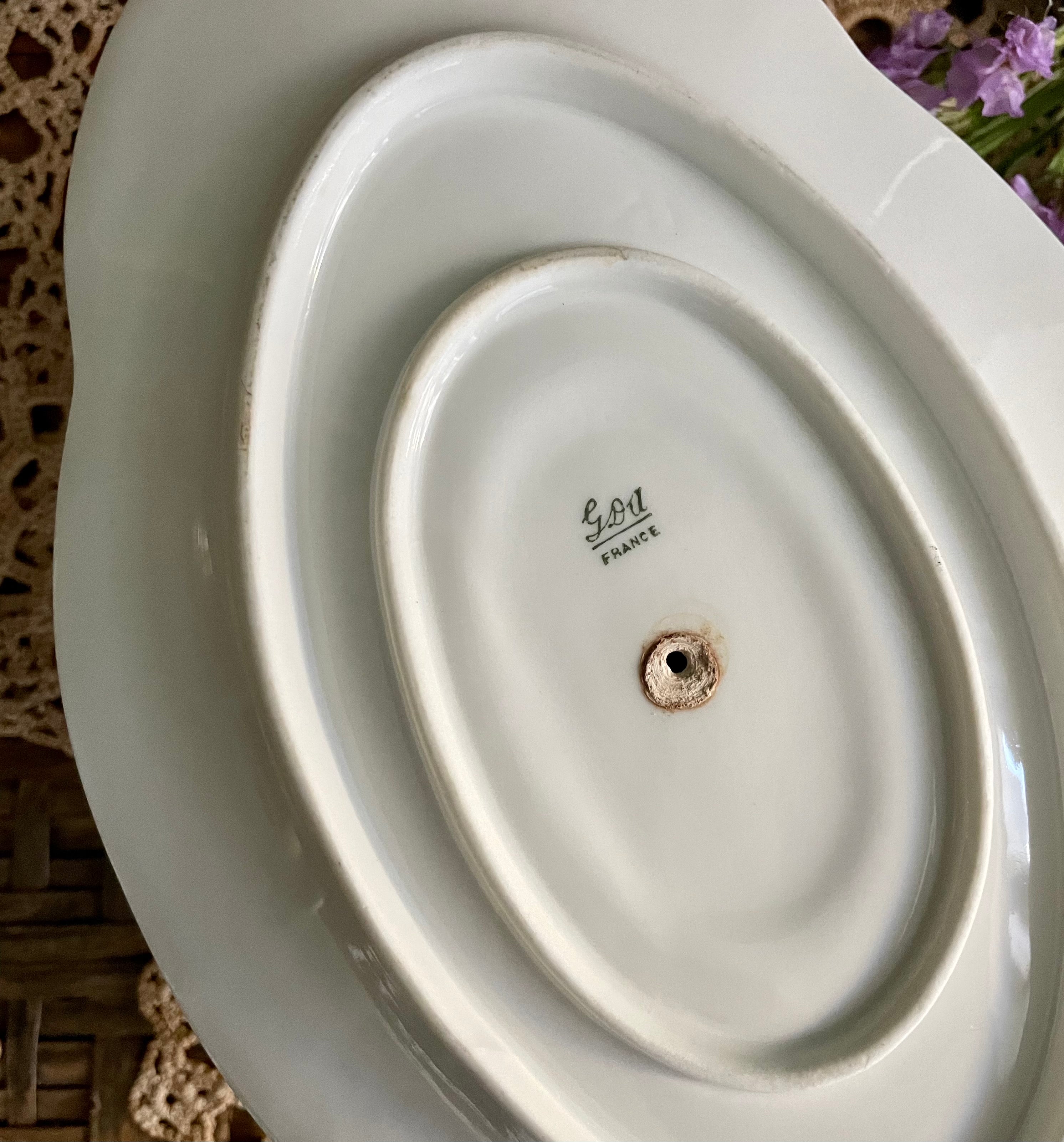 Salsiera francese bianca, in perfette condizioni. Misura 18cm, con il vassoio (che non è divisibile) 24 cm.