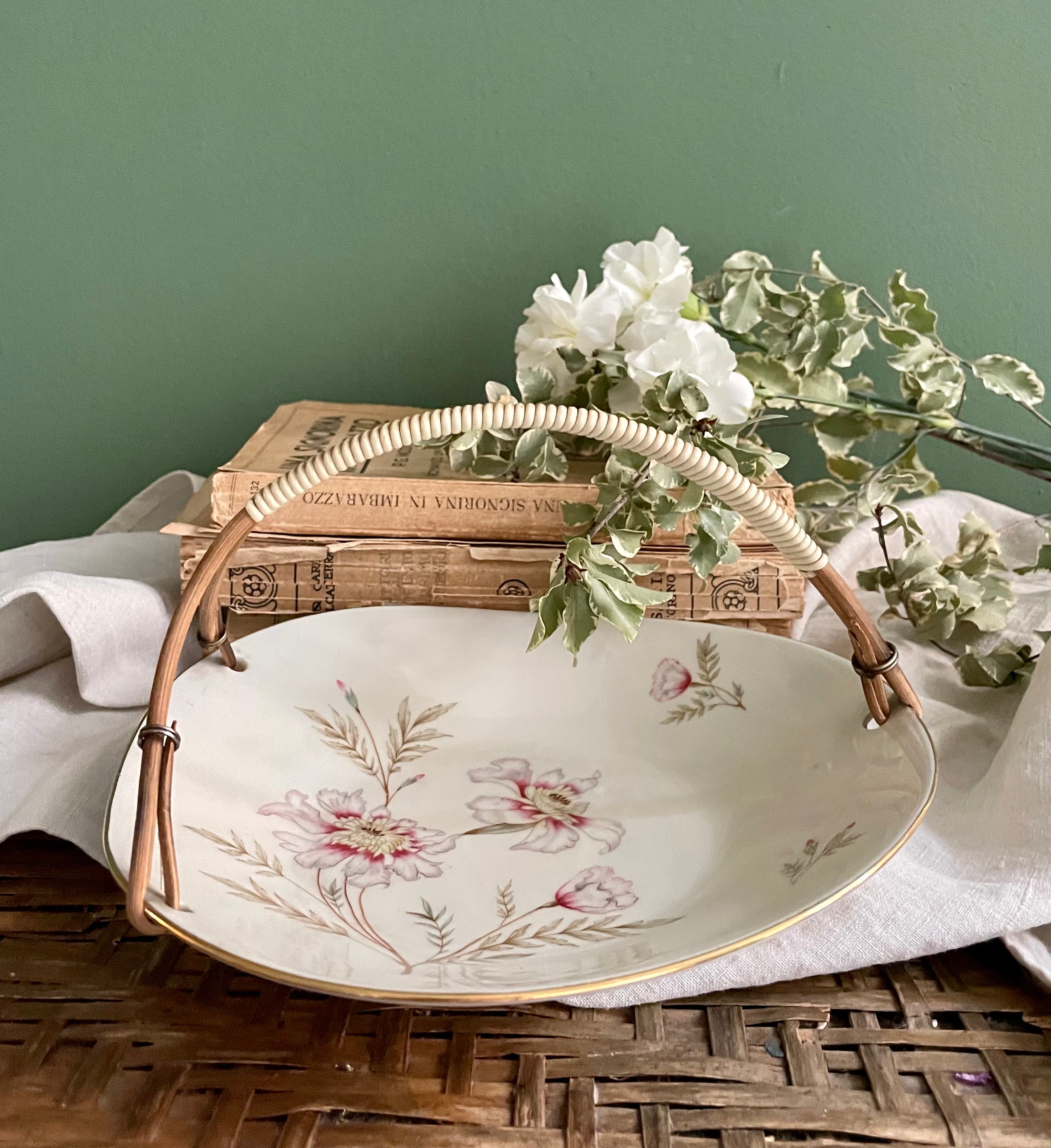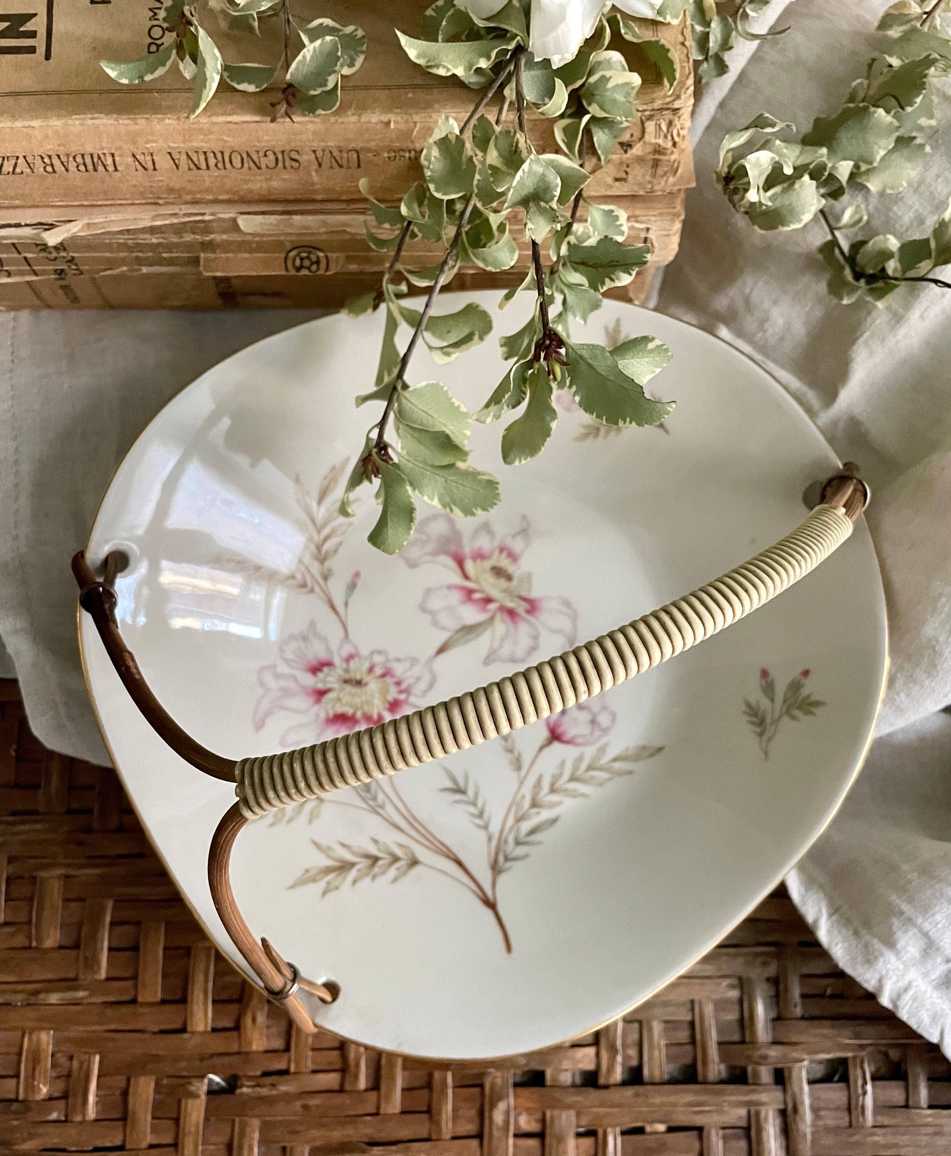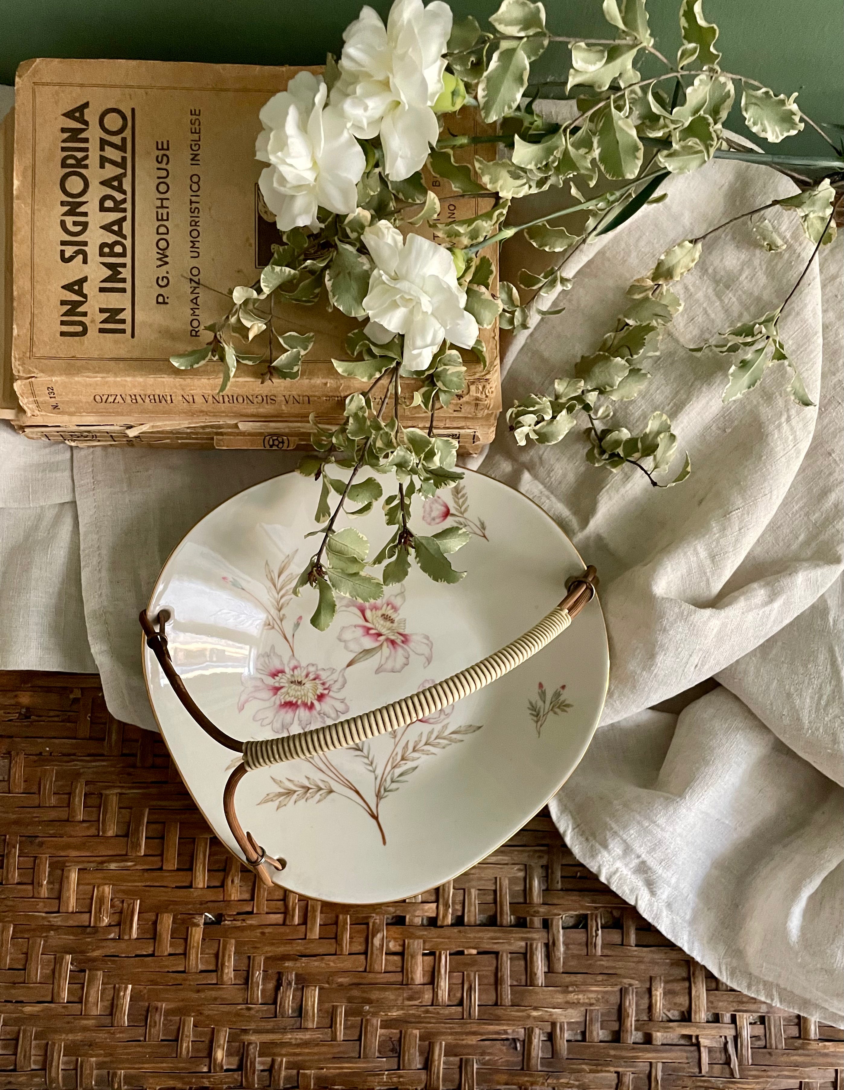 Di questo particolare vassoio (svuota tasche) mi hanno colpita la forma irregolare ed il manico in legno. Di provenienza tedesca (Zeh Scherzer Bavaria) ha un decoro floreale ed il bordino dorato.